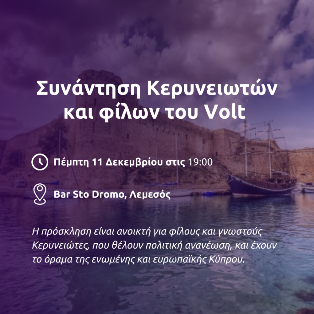 Σας προσκαλούμε σε δύο χαλαρές αλλά πολύ σημαντικές συναντήσεις Κερυνειωτών, μελών και φίλων του Volt, για να γνωριστούμε καλύτερα και να οργανωθούμε ενόψει των επερχόμενων βουλευτικών εκλογών του 2026.