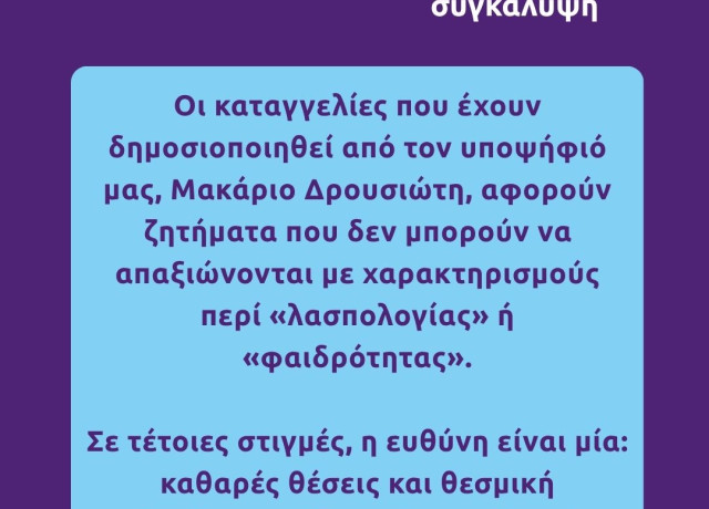 Τα όσα έχουν δημοσιοποιηθεί από τον υποψήφιό μας, Μακάριο Δρουσιώτη, εγείρουν σοβαρά ερωτήματα που αφορούν τη λειτουργία των θεσμών και το κράτος δικαίου. Σε μια σύγχρονη ευρωπαϊκή δημοκρατία, τέτοιες καταγγελίες που αφορούν θεσμική διαφθορά δεν μπορούν να αγνοούνται. Το Volt επιμένει στο αυτονόητο: πλήρη, ανεξάρτητη και σε βάθος διερεύνηση, με απόλυτη διαφάνεια.